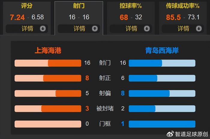 中超比赛强弱还要靠射术,上海海港的控球率高达68%,但两队都是16次射门,其中上海海港是8次射正,青岛西海岸是6次射正,比分是4-1,武磊就是中超最强“神枪手”。