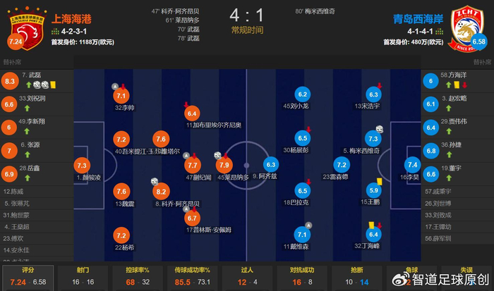 上海海港vs青岛西海岸,穆斯卡特排出4231阵型,首发身价1188万欧元,武磊新赛季伤愈复出继续替补待命;郑智排出4141阵型,首发身价480万欧元。
